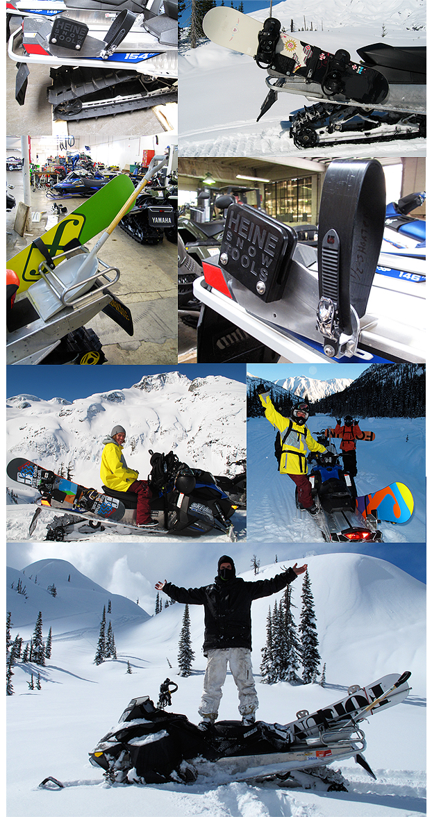 Take your snowboards with you into the backcountry. This lightweight aluminum snowboard rack is designed to fit all ski-doo snowmobiles. The Heine Snow Tools snowboard rack has been tested to with stand the bumpy trails & cold temperatures down to -50 degrees. The entire Forum snowboard team uses Heine Snow Tools racks on their snowmobiles.